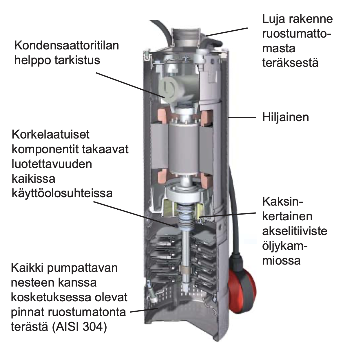 Moniportainen uppopumppu, moottori ja pumppu yhteenrakennettuna