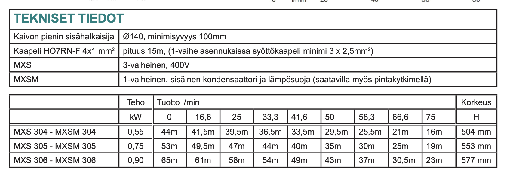 Calpeda MXS 306 tarjoaa MXS-sarjan suurimman tehon ja nostokorkeuden. Ruostumattomasta teräksestä valmistettu rakenne, 0,90 kW moottori ja jopa 65 metrin nostokorkeus tekevät siitä luotettavan vaihtoehdon, kun tarvitaan tehokas pumppu kaivojen ja vesivarastojen tyhjennykseen. Helppo asennus, pitkä kaapeli sekä IP X8 -suojaus varmistavat varman ja huolettoman käytön.