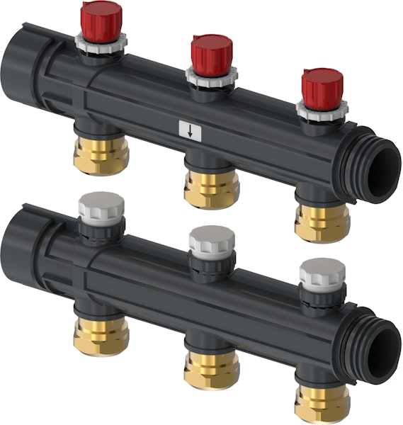 Vesikiertoisen lattialämmityksen jakotukki suurten pinta-alojen lämmittämiseen ja viilentämiseen. Max. 20 lähtöä/jakotukki, maksimipaine 6 bar. Jakotukki sisältää meno- ja paluutukin, liitinväli 100 mm. Jakotukki sisältää virtauksen säätöventtiilin ja siihen voidaan kytkeä Uponor-toimilaite (Uponor-nro 1000138 tai 1005605). Jakotukkiin voidaan liittää suoraan 25 mm putki.