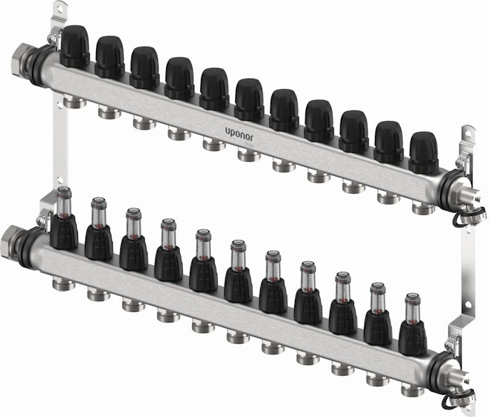 Ruostumattomasta teräksestä valmistettu esikasattu jakotukki, joka sisältää virtausmittarit. Jakotukkia on saatavana 2-12 lähtöisenä ja se voidaan halutessa asentaa Uponor Vario -jakotukkikaappiin.