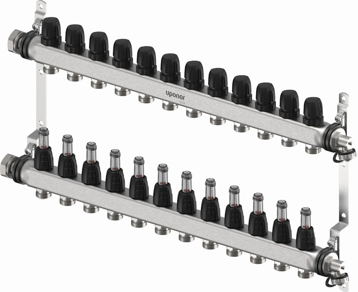 Ruostumattomasta teräksestä valmistettu esikasattu jakotukki, joka sisältää virtausmittarit. Jakotukkia on saatavana 2-12 lähtöisenä ja se voidaan halutessa asentaa Uponor Vario -jakotukkikaappiin.