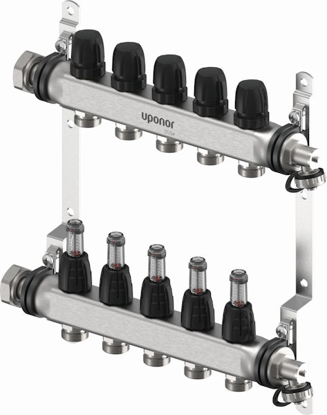 Ruostumattomasta teräksestä valmistettu esikasattu jakotukki, joka sisältää virtausmittarit. Jakotukkia on saatavana 2-12 lähtöisenä ja se voidaan halutessa asentaa Uponor Vario -jakotukkikaappiin.