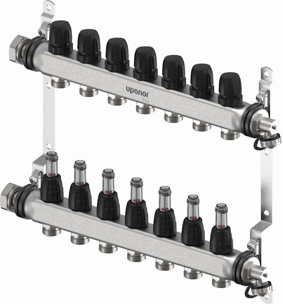 Ruostumattomasta teräksestä valmistettu esikasattu jakotukki, joka sisältää virtausmittarit. Jakotukkia on saatavana 2-12 lähtöisenä ja se voidaan halutessa asentaa Uponor Vario -jakotukkikaappiin.