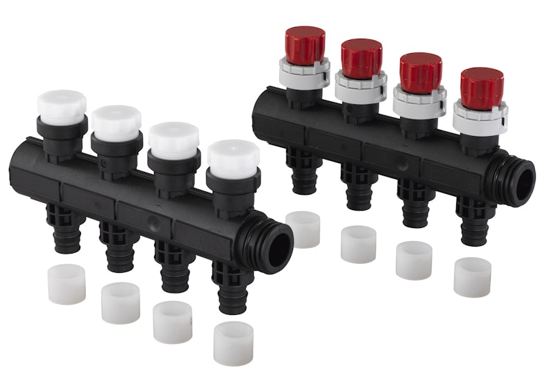 Modulaarinen lasikuituvahvisteisesta polyamidista valmistunut lattialämmityksen jakotukki. Paluujakotukin käsisäätöpyörä voidaan korvata toimilaitteella. Jakotukissa Q&E-liitos.
