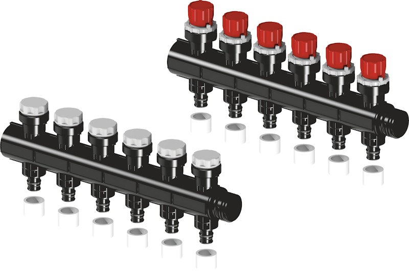 Modulaarinen lasikuituvahvisteisesta polyamidista valmistunut lattialämmityksen jakotukki. Paluujakotukin käsisäätöpyörä voidaan korvata toimilaitteella. Jakotukissa Q&E-liitos.