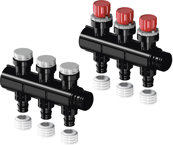 Modulaarinen lasikuituvahvisteisesta polyamidista valmistunut lattialämmityksen jakotukki. Paluujakotukin käsisäätöpyörä voidaan korvata toimilaitteella. Jakotukissa Q&E-liitos.