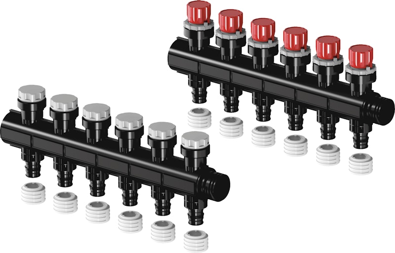 Modulaarinen lasikuituvahvisteisesta polyamidista valmistunut lattialämmityksen jakotukki. Paluujakotukin käsisäätöpyörä voidaan korvata toimilaitteella. Jakotukissa Q&E-liitos.