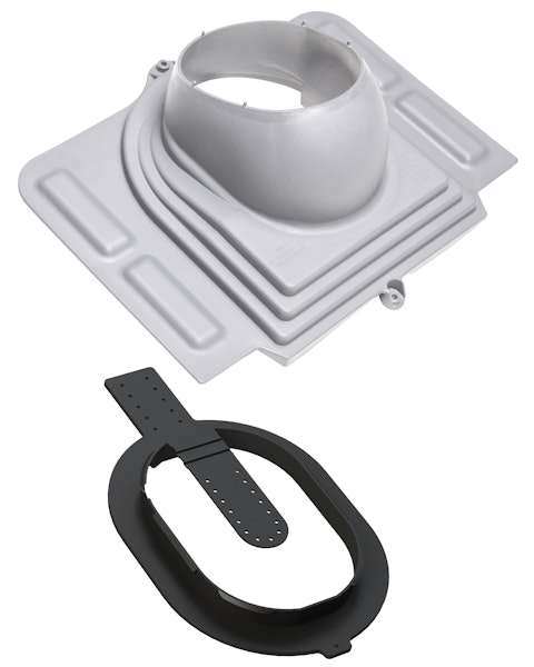Käyttökohteet: Sopii matalaprofiilisiin peltikatteisiin. Läpiviennin tiiviys perustuu kumikartioon, jonka alareunaan on valettu muotoiltava alumiinilaippa. Peltiprofiilin muotojen korkeusero ei saa ylittää 38 mm. Sisältö: Läpivienti, aluskaterengas, aluskatetiiviste Click, ruuvit, sapluuna/asennusohje.