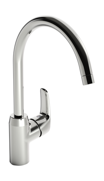 Keittiöhana, jossa on kääntyvä, korkea juoksuputki. Juoksuputken kääntymiskulma on 120° (mahdollista rajoittaa 0° tai 60°). Joustavat kytkentäputket.