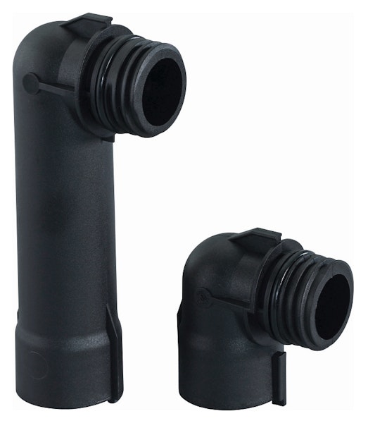 Uponor Vario PLUS jakotukin kytkentäsarjaa käytetään, kun syöttöputki tulee alhaalta tai ylhäältä päin jakotukille. Pakkaus sisältää kaksi eripituista kulmaosaa, jolloin syöttöputket saadaan rinnakkain.