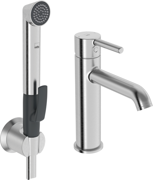 Oras Optima Style 2606FH-80 on harjatun teräksen värinen pesuallashana, jossa on Bidetta-käsisuihku, puikkomainen vipu ja joustavat kytkentäputket. Hanan virtaama on 6 l / min.